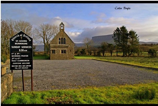 St Kevins church is located in the parish of Lissadell. It was built by the Gore-Booth family of Lissadell House as a chapel of ease in 1895. It was consecrated in 1896 A chapel of ease is a church building other than the main parish church, built within the parish for people to attend as they cannot easily get to the main church. It is known locally as Munninane church. The rector of the church is Archdeacon Isaac Hanna. In 1995 the church was re-decorated and this included a new stain glass window. Our favourite part of this window is the dove.